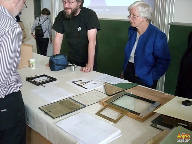 Durante las presentaciones habían pequeños descansos de media hora llamados "Coffe break" (una por la mañana y una por la tarde) que se celebraban en una sala adjunta, en la que habia una pequeña exposición de reglas (mas tarde pondré las imágenes) y una mesa con diferentes bebidas y "tentempiés", y en los cuales se podían comentar con los oradores detalles de sus presentaciones u observar los modelos que exponían como ejemplos, en la imagen aparecen una serie de planimetros: