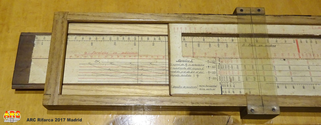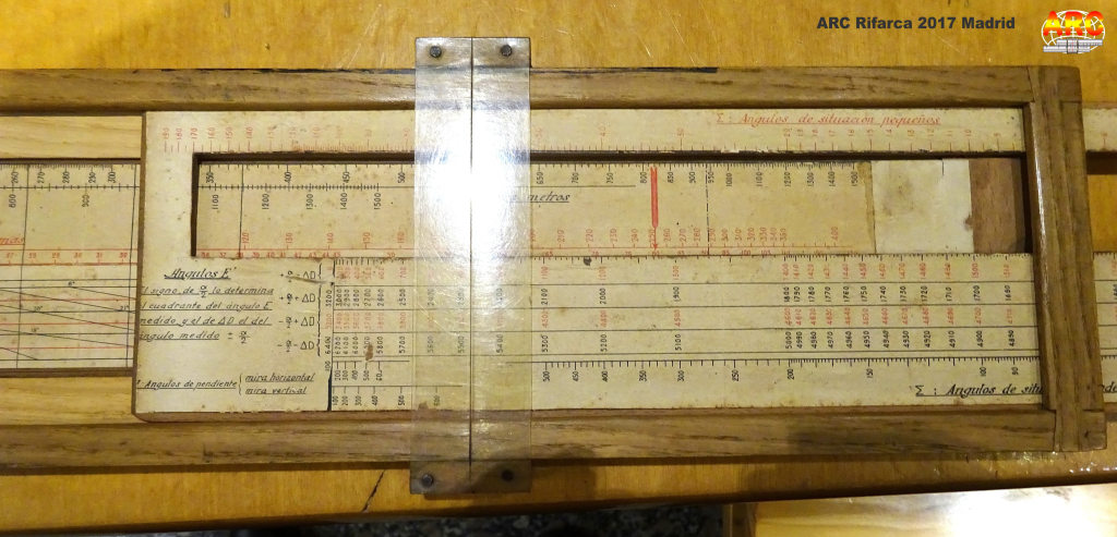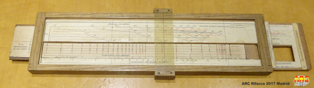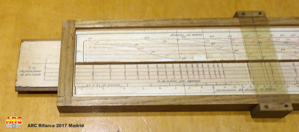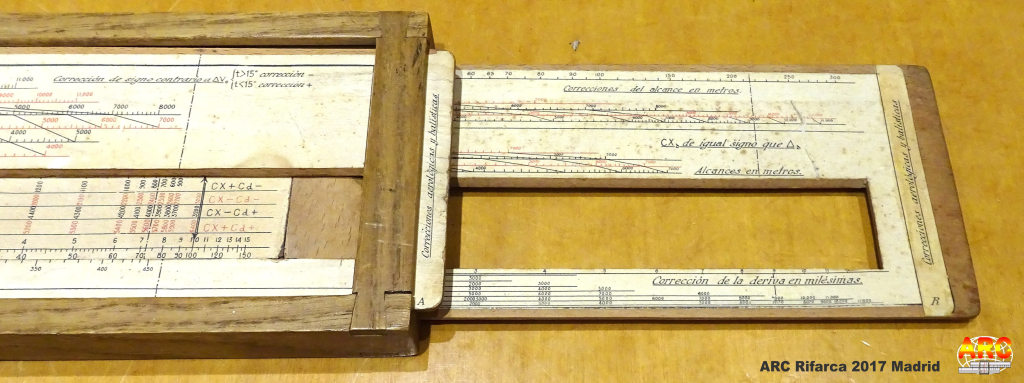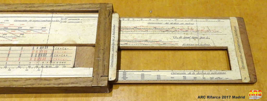 La regla española de Antonio tiene pinta de ser para artillería, en la foto 10 se puede leer "corrección de deriva en milésimas", "Alcance en metros", y un texto que no llego a leer bien pero parece "correciones aerológicas y balísticas". En cualquier caso me ha parecido una regla muy especial, casi casi artesanal, buen hallazgo.