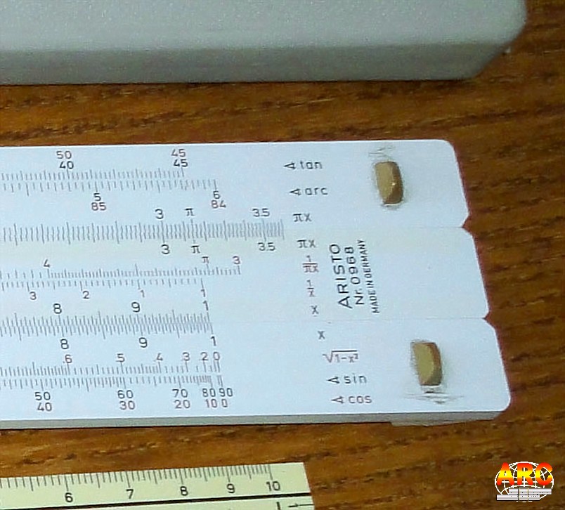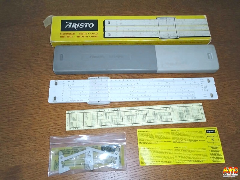 -   Aristo Studio (Nº 0968). Esta se nota que ha sido bastante usada. La tengo con caja, con unas patitas para la mesa sin estrenar (están dentro de la bolsita original, aunque a mí personalmente me parecían bastante incómodas) y una regleta de cartón plastificado en perfecto estado donde venían impresas unas tablas de equivalencias entre unidades y que solían incluirse con las reglas.