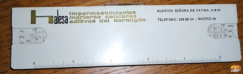 -   Faber-Castell 67/54b. Esta regla tiene la particularidad de que corresponde a una serie que regalaba una empresa de aditivos para el hormigón que aún existe y que se llama HALESA. La propaganda está impresa en el reverso de la regla. La regla esta impecable y viene con la caja de cartón, la funda para el bolsillo y el manual originales.