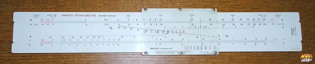 -   Aristo Stahlbeton (Nº 939). La regla está bastante cuidada, pero no tengo manual, ni caja. Es una regla atípica que se usaba para el cálculo de secciones de hormigón armado. Con esta regla se calculaba la armadura que había que disponer en las vigas, losas, etc. y además podían obtenerse las tensiones en el hormigón. Esta no es fácil de encontrar, yo las he conseguido porque la empresa donde trabajo se ha trasladado de Madrid a Alcobendas y en la mudanza apareció en el fondo del almacén una caja llena de polvo con reglas viejas, que alguien decidió que ?aquello no servía para nada y se podía tirar, porque esto ya no lo usa nadie?. ¡Genial!