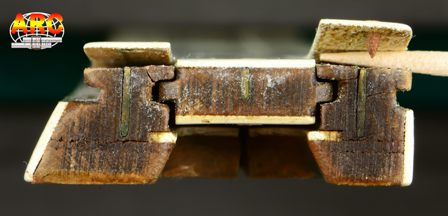Vean en la tercera foto (increíble Jefazo !) las grietas que se formaron en la placa plástica, a continuación de las líneas grabadas en c/u de los números... Evidentemente no salió así de fábrica... Probablemente ahi tenemos otra expresión del envejecimiento del plastico en presencia de tensiones residuales de la fabricación, estrés térmico, o el trabajo forzado por la madera (aunque longitudinalmente no trabaja tanto).