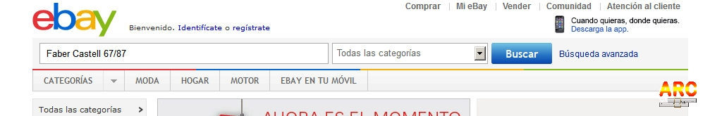 Vamos a la pagina de eBay (en este caso eBay España), tecleamos en el recuadro de búsqueda "Faber Castell 67/87" y le damos a la pestaña Todo el mundo: