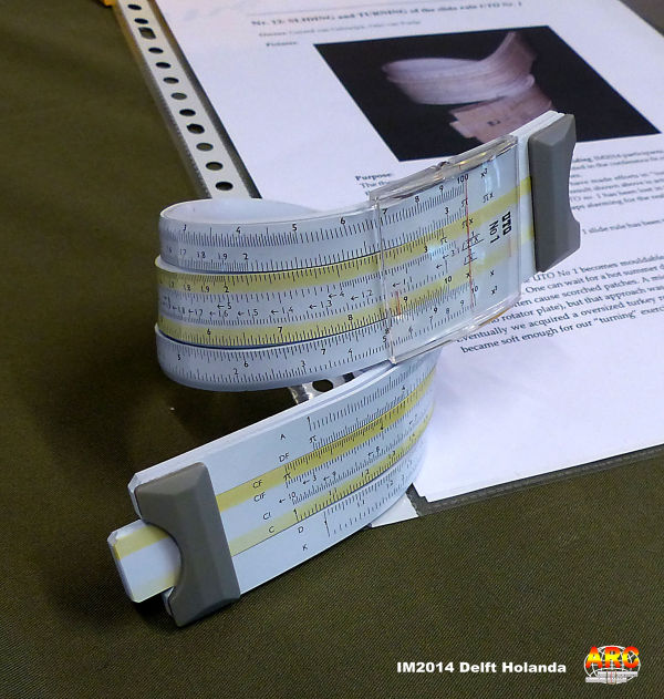 El "objetivo" de doblar una regla "buena" era crear una regla en "espiral", de manera que representara a la perfección el "leimotiv" del encuentro, a saber, "turning and sliding". Y creo que fue "a la tercera va la vencida". Según comentaron (por si a alguien se le cruzan los cables) la metieron en agua calentándose, hasta que notaron que estaba "en su punto". Entonces, a cuatro manos, rápido antes de que se enfriara y endureciera, y con mucho cuidado de no quemarse, la enroscaron en un cilindro. nv8 nv8
