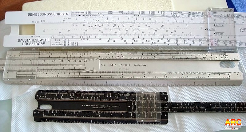 • JB: La hormigonera Nestler 0440 es una regla especial puede calcular en rotura (la única?). Poca información hay de ella y se encuentra aquí en ARC. Recientemente he encontrado alguna información en [link] He podido consultar las normas holandesas por las que se rige la regla y un librito que explica el método de rotura que se sigue en ellas. También he elaborado un papelito en el que muestro, por ejemplo, la relación de la regla con la "parábola de Madrid", el porqué del 35 rojo en la escala central, del coeficiente de seguridad 1,8 que se repite, la expresión algebraica de los parámetros de la regla y relación entre ellos, la revisión de los ejercicios del manual y la humorada de ver cómo se comporta la regla resolviendo 4 ejercicios del "Hormigón Armado, de J. Montoya" (adelanto que sorprendentemente bien). Sé que es un ámbito de interés muy específico, sólo para aquellos miembros de la Orden de los Caballeros de la Regla muy hormigoneros. Si hay interés, puedo compartir el papel, si se me indica cómo.